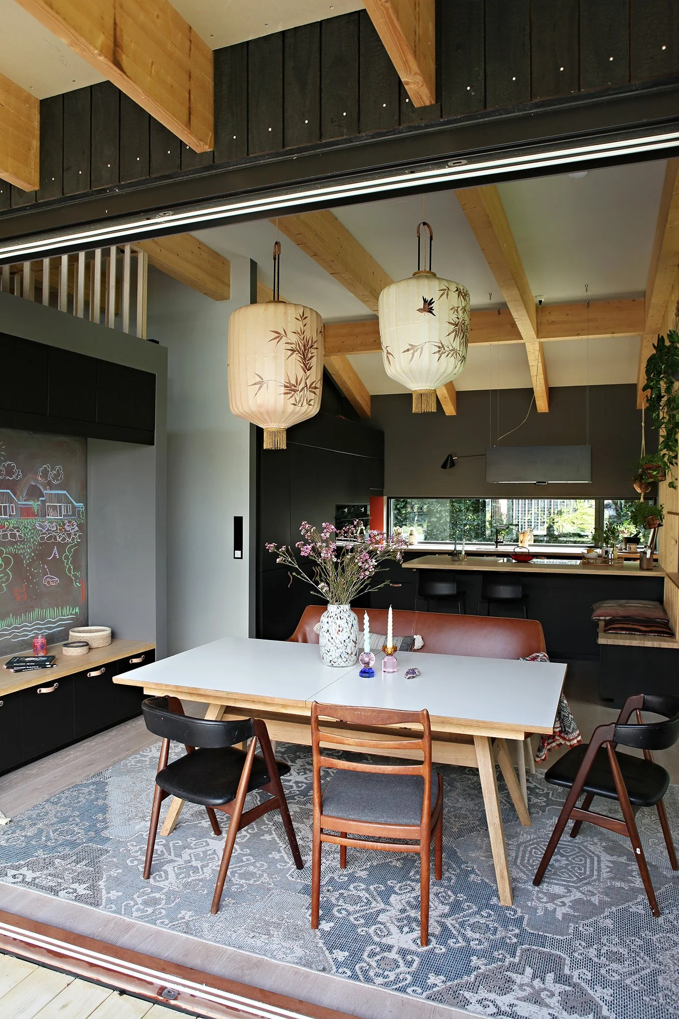 Fasadene, som er dekket med brent kledning lukker seg mot alle sider bortsett fra mot hagen og sjøen. Kjøkken, stue og oppholdsrom ligger vendt mot hagen, utsikten og sjøen. Fra stuen ser man ut på bølgende siv, fugl og dyreliv. Man har direkte kontakt med den store hagen der det også ligger et strandhus, en lekestue, et hønsehus og masse boltreplass for store og små. Husene fremstår som et familievennlig paradis, – åpent, trygt og med masse rom for lek. Innvendig er huset preget av høy takhøyde, synlig takkonstruksjoner og åpenbare men lekne volumer med små morsomme kuriositeter som innvendig utedusj og en liten, hemmelig hems til barna.