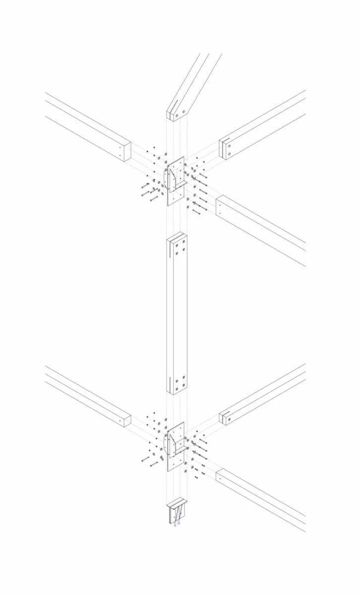 Konstruksjonen er basert på tradisjonelt grindverksbygg og består av sperrer, bjelker og søyler i limtre og stålbeslag med bolter som knytter komponentene i tre sammen i knutepunktene.